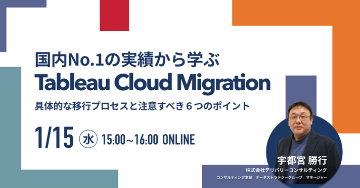 2025.01.08 イベント・セミナー情報 ご好評により再開催!「国内No.1の実績から学ぶ Tableau Cloud Migration 具体的な移行プロセスと注意すべき6つのポイント」 当社がTableau Japan(現:株式会社セールスフォース・ジャパン)設立時からのアライアンスパートナーとして多くの企業を支援してきたナレッジをもとに、Tableau ServerとTableau Cloudを比較しながらクラウド移行のポイントについてお伝えするWEBセミナーを開催いたします。 ■テーマ 国内No.1の実績から学ぶ Tableau Cloud Migration 具体的な移行プロセスと注意すべき6つのポイント ■参加申し込み https://service.deliv.co.jp/seminor/tableau ■セミナー概要 DX推進の一環としてクラウド活用が進む中、データの一元管理や可視化による意思決定の迅速化は、多くの企業にとって重要な課題です。本セミナーでは、デリバリーコンサルティングが100件以上のTableau案件から得た知見を基に、クラウド環境への移行をスムーズに進めるためのポイントを解説します。データの散在による業務効率の低下や、システム維持管理コストの増加といった課題に対し、クラウド移行がどのように解決をもたらすか、具体的な成功事例もお伝えします。クラウド移行を検討中の企業様や、データ分析基盤の刷新をお考えの方に向けて、実践的な知識や成功へのヒントを提供する内容です。ぜひお役立てください。 ■開催概要 日時 2025年1月15日(水) 15:00~16:00 参加費 無料 定員 100名 会場 ウェビナー配信 ■登壇者 株式会社デリバリーコンサルティングコンサルティング本部 データストラテジーグループ マネージャー宇都宮 勝行2021年にデリバリーコンサルティングに入社後、Tableauや他BIでのViz開発をはじめTableau Server / Tableau Cloudの構築支援及び運用ガバナンス・ルールの策定支援など、BI製品の導入支援に約10年従事。最近ではTableau Cloud Migrationを中心に対応。