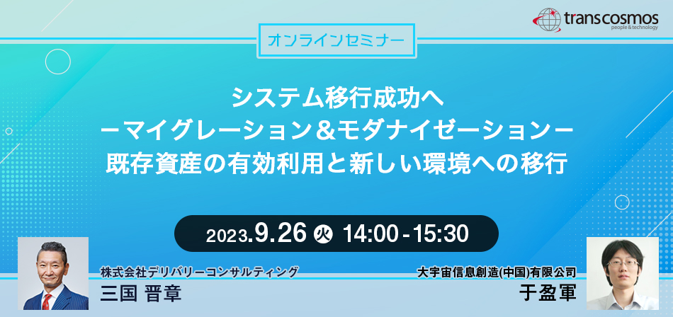 2023.10.30 プレスリリース トランスコスモス社主催のオンラインセミナー「システム移行成功へ- マイグレーション&モダナイゼーション」に当社の三国 晋章が登壇しました。 9月26日(火)に開催されたトランスコスモス社主催のオンラインセミナーに当社の事業開発部長・三国 晋章が登壇いたしました。 各企業様において、DX化推進の声が広がる中で社内情報の有効活用や情報連携を実施出来る環境作り、また老朽化したシステムの移行に伴ってビジネス運用モデルを最適化し、コスト効率と生産性を向上させ、変革の機会を創出しようとされています。 本セミナーでは、30年に渡りデータ基盤構築からデータ分析環境構築及びデータ活用コンサルティングに従事してきたその道のスペシャリストであるコンサルティング本部 事業開発部 部長の三国 晋章がスピーカーとして登壇し、既存のシステムを新しいシステムへ移行するマイグレーション、既存のIT資産を活用しながら新しいシステムを構築するモダナイゼーションとトランスコスモスグループの豊富な経験をご紹介いたしました。 詳細につきましては下記のプレスリリースをご覧ください。 https://prtimes.jp/main/html/rd/p/000000014.000108457.html